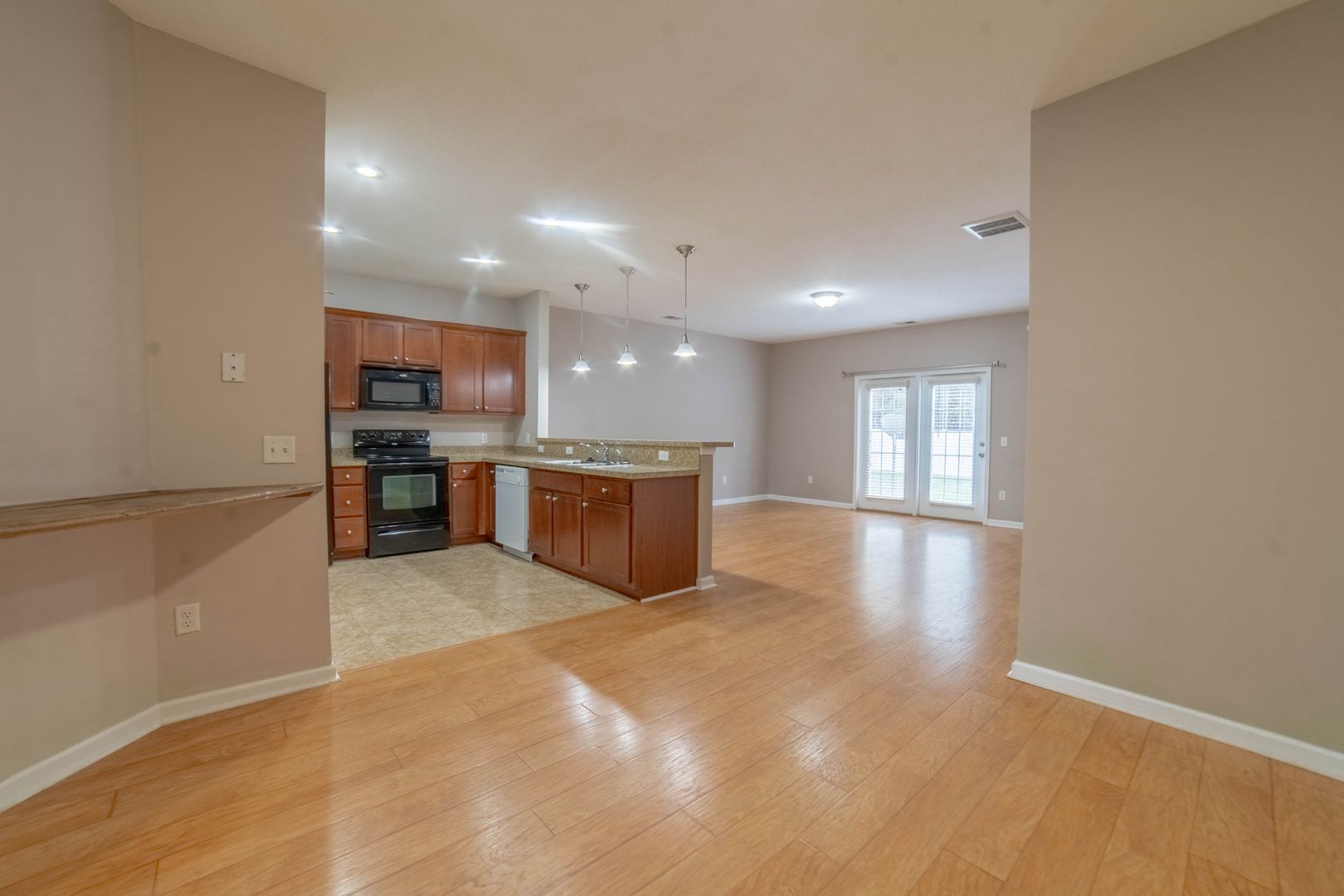 - Maple cabinetry overlooking the living area for a warm, connected feel.