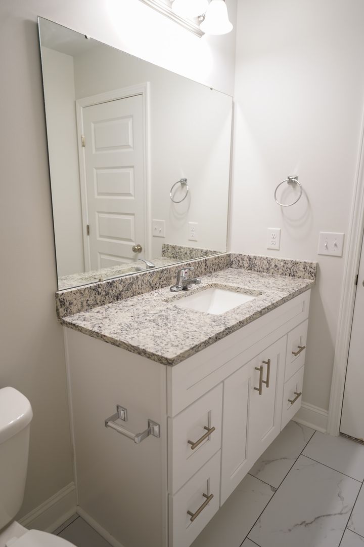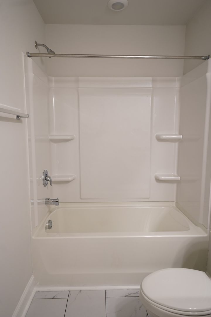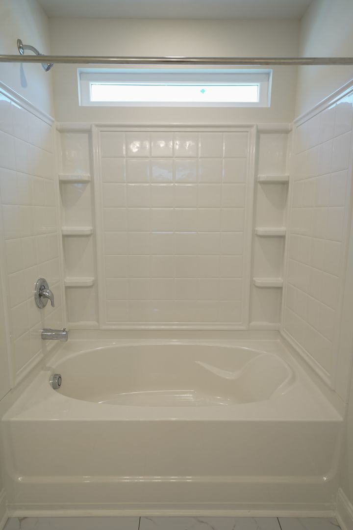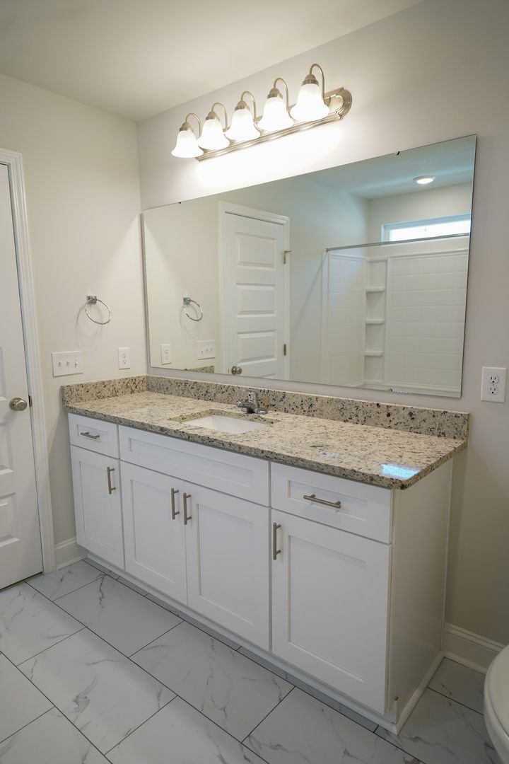 - Master bath featuring double sinks, granite countertops, tile flooring, and shower/tub combo