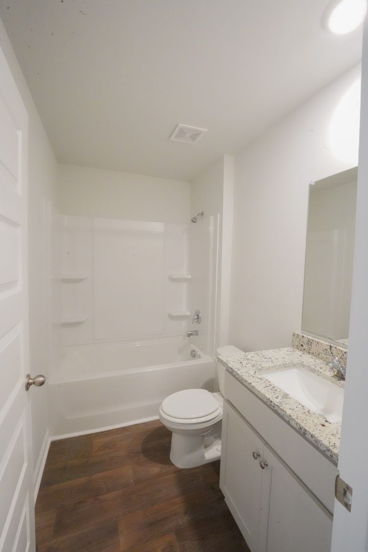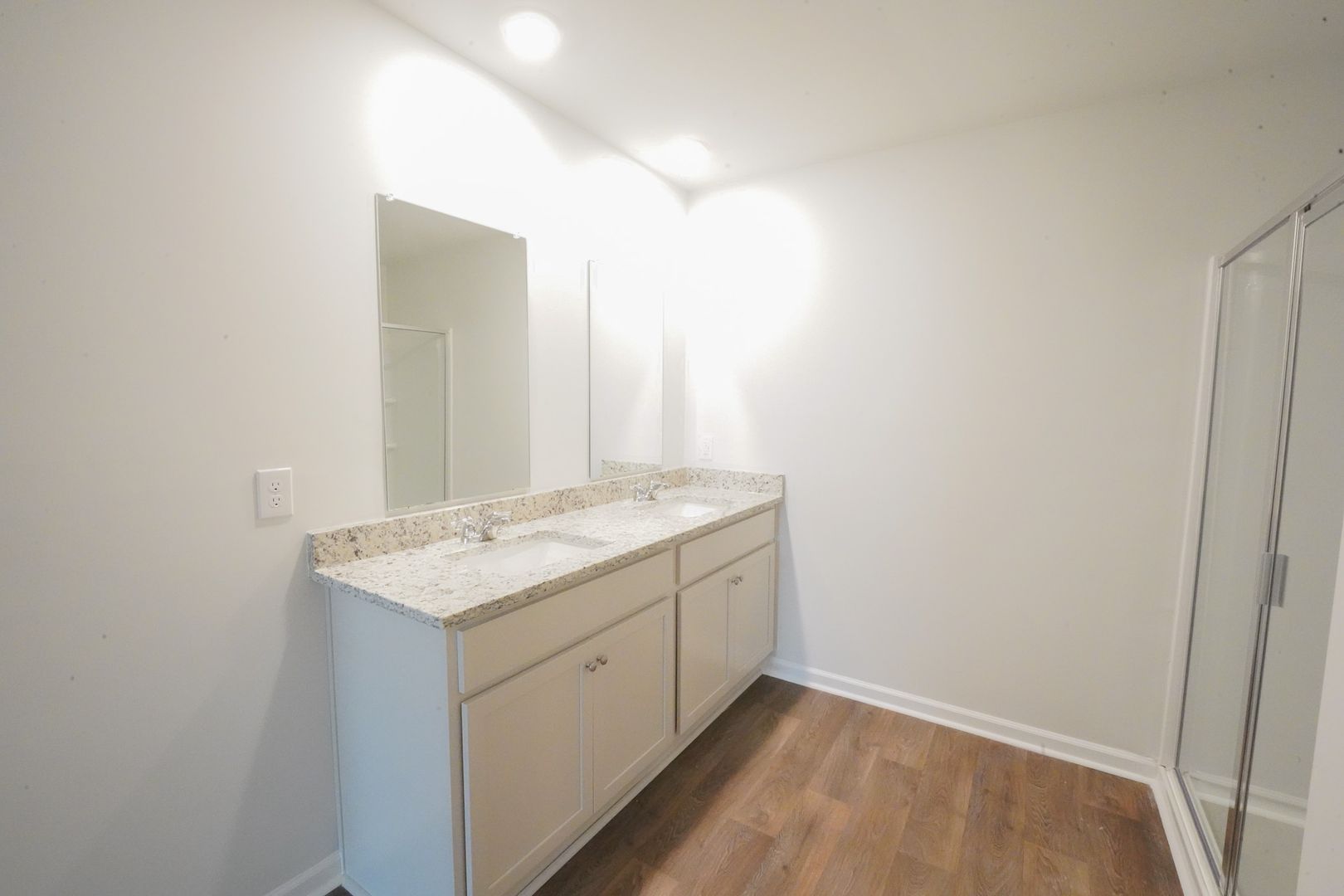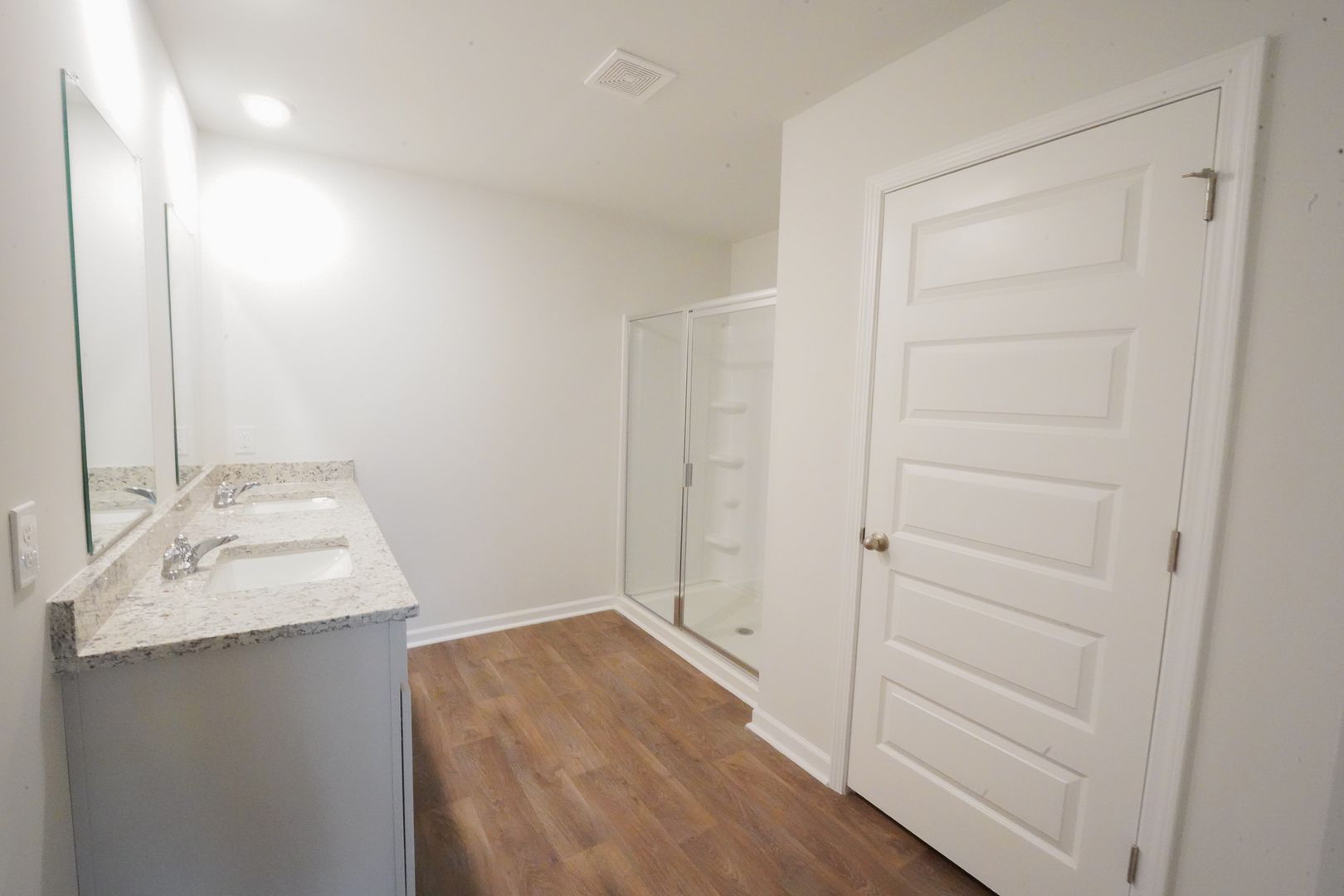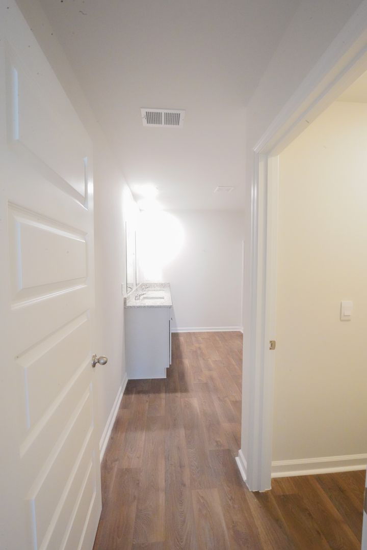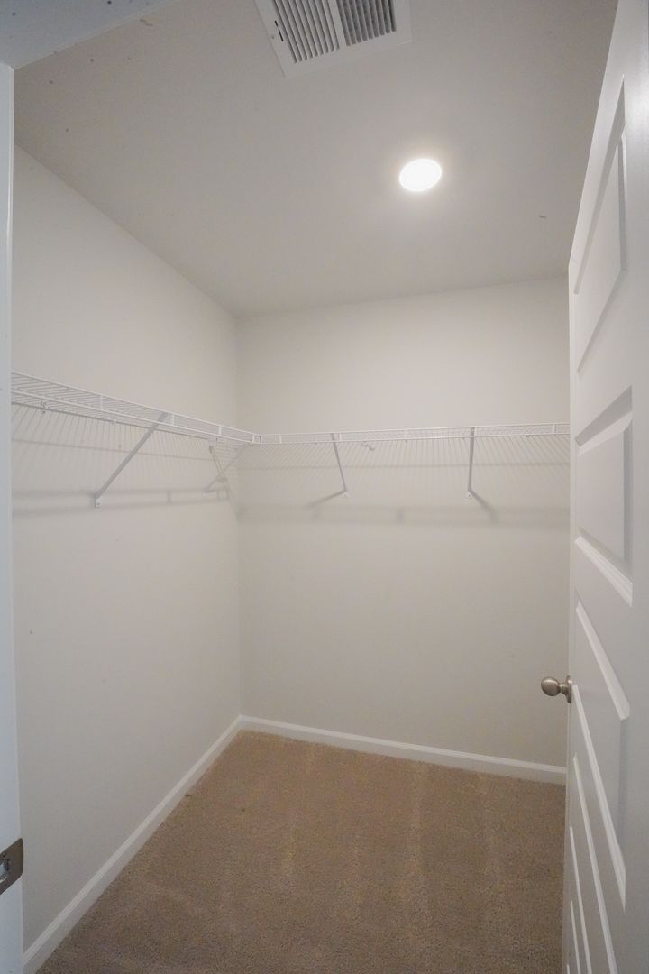 - Primary suite with walk-in closet and spa-inspired bath featuring dual vanity, 5-ft walk-in shower with glass door, and separate water closet