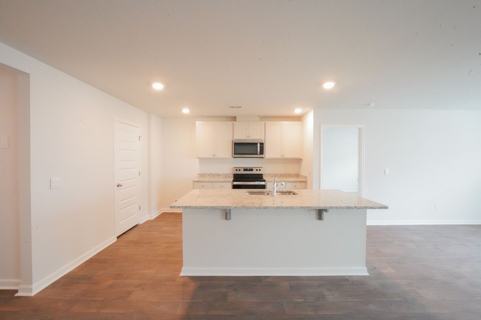 - Open kitchen with granite countertops, counter-height island, ample cabinet space, walk-in pantry, and stainless-steel appliances (hood vent microwave, dishwasher, glass-top range)