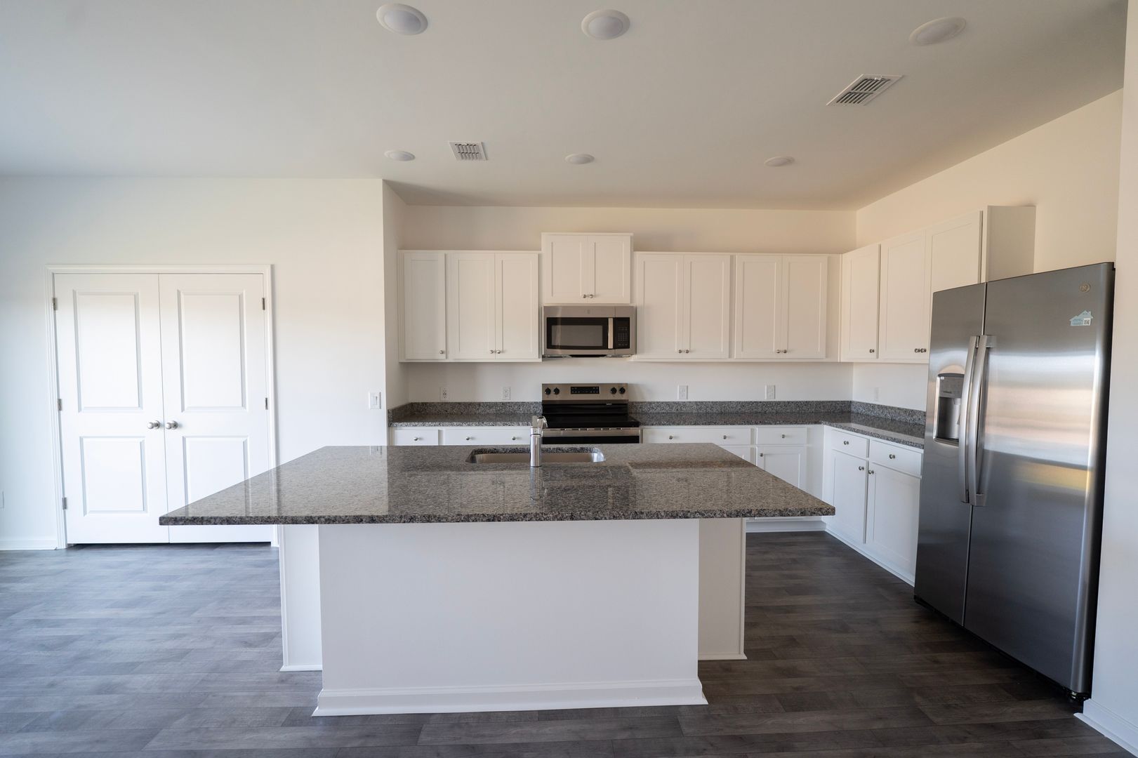 - Striking kitchen with quartz countertops, large center island, and pantry