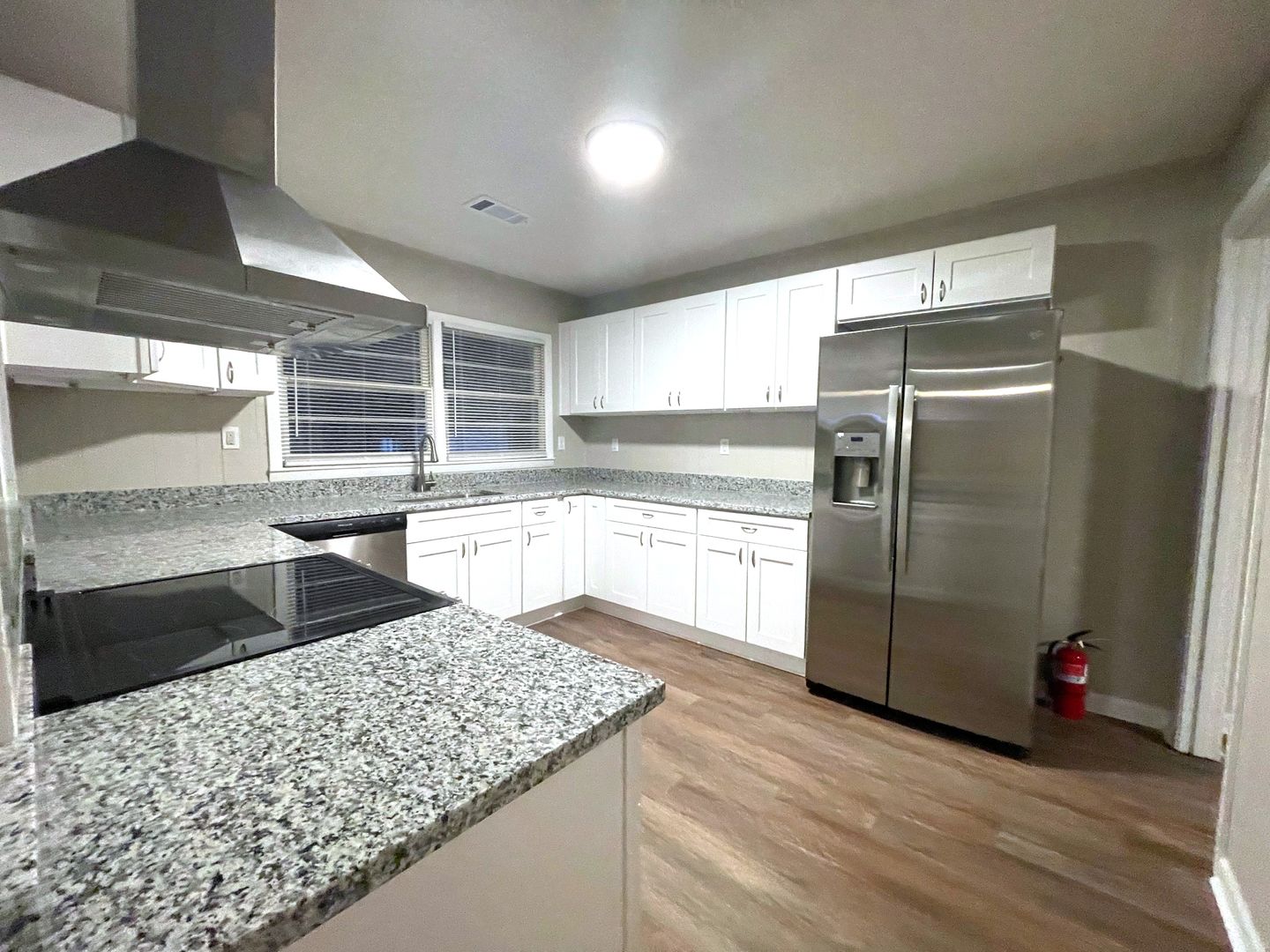 - Updated kitchen with stainless steel appliances, white cabinetry, and abundant counter