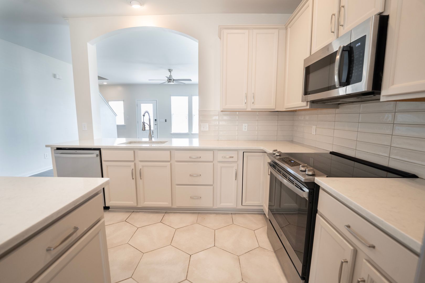 - Bright kitchen with new quartz countertops, tile backsplash, and an oversized island