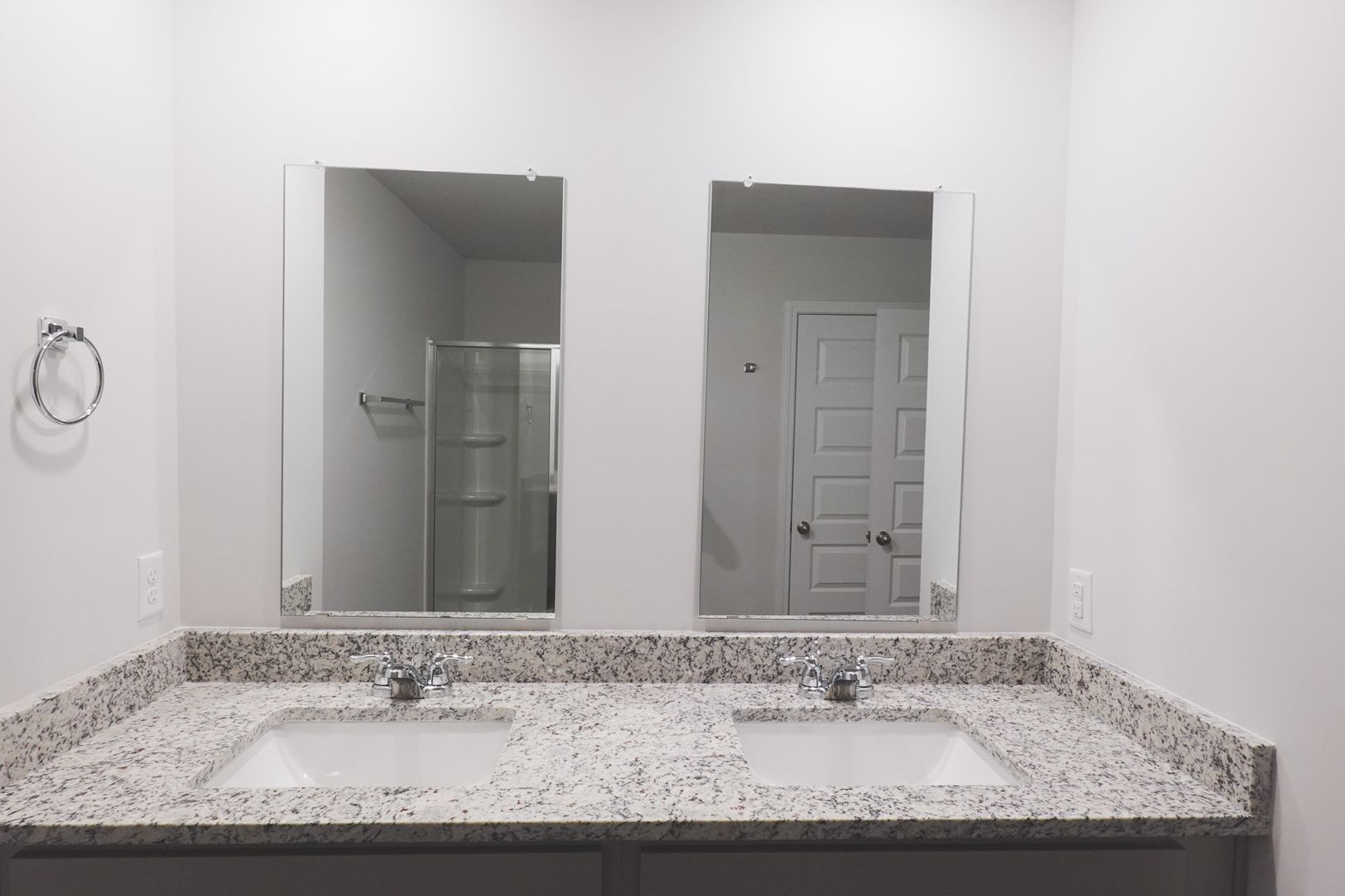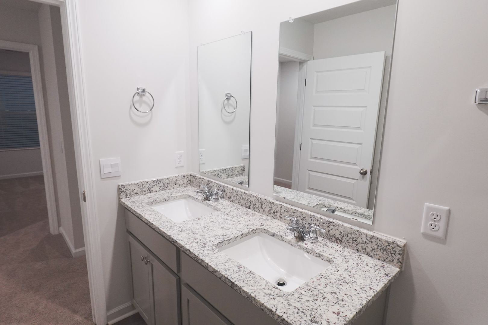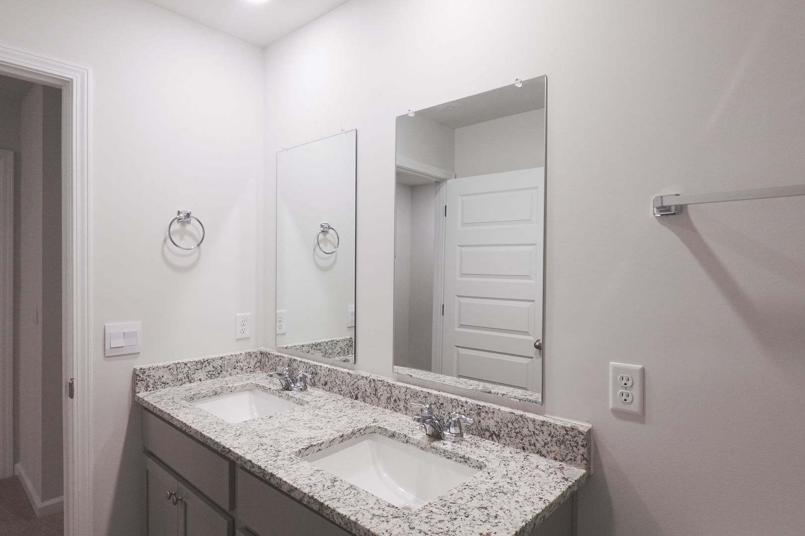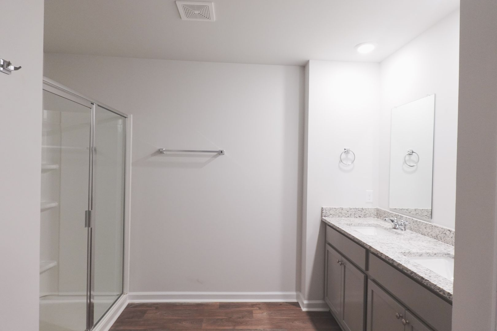 - Spacious primary suite with walk-in closet, dual-sink vanity, 5-ft walk-in shower with glass door, private water closet