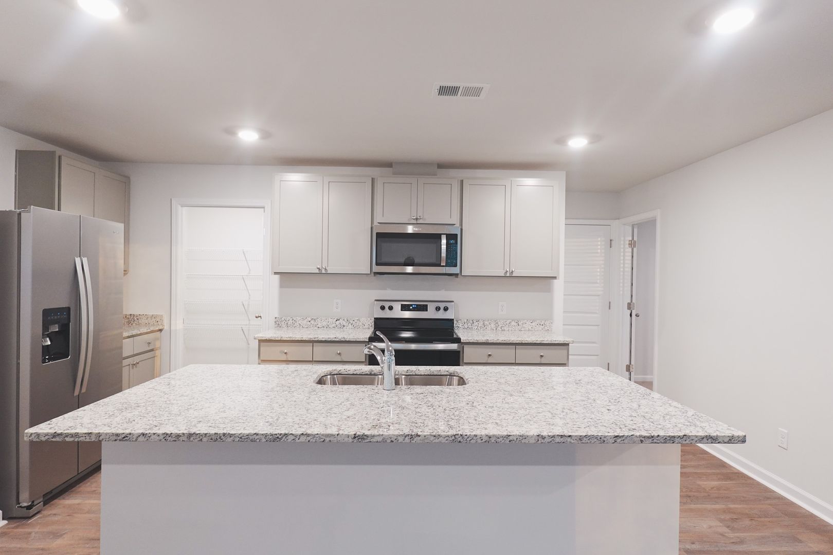 - Kitchen with granite countertops, counter-height island, and walk-in pantry