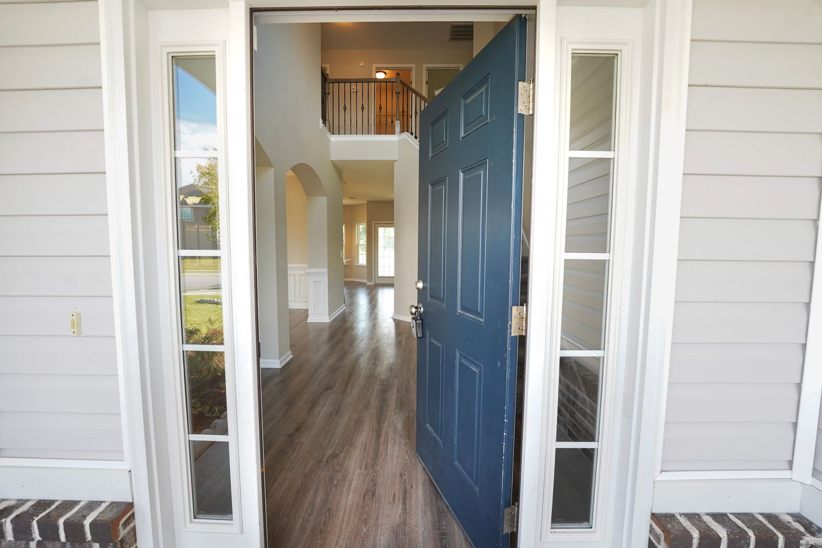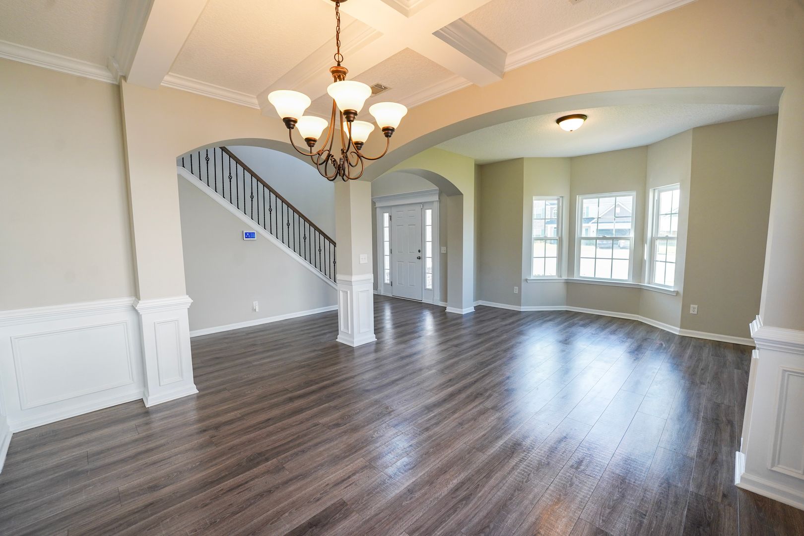 - Two-story foyer with iron spindles leading to a formal living room and dining room with coffered ceilings