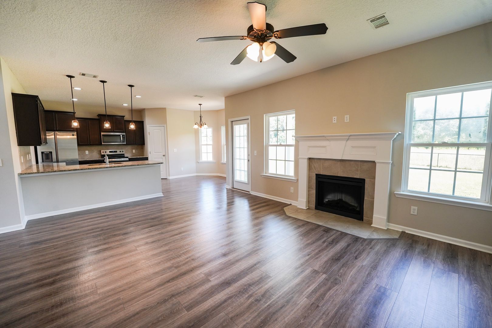 - Open-concept family room with electric fireplace