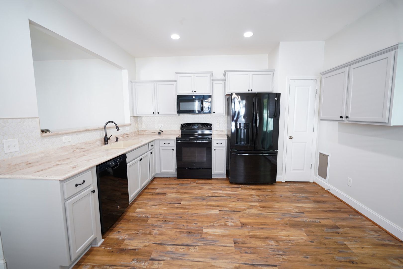 - Open kitchen with staggered cabinets, breakfast bar, and abundant counter/storage space