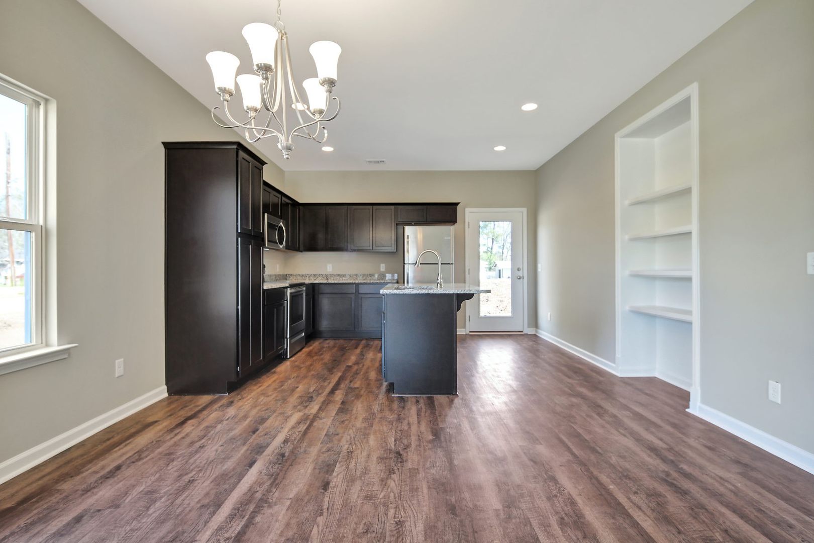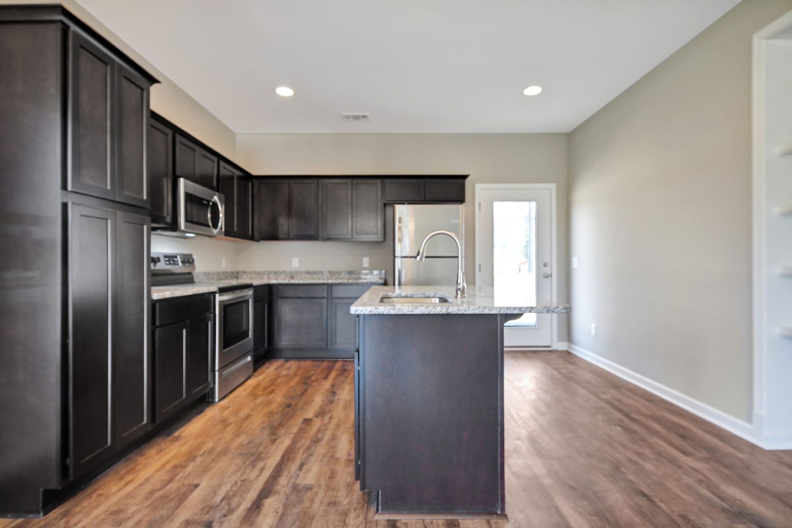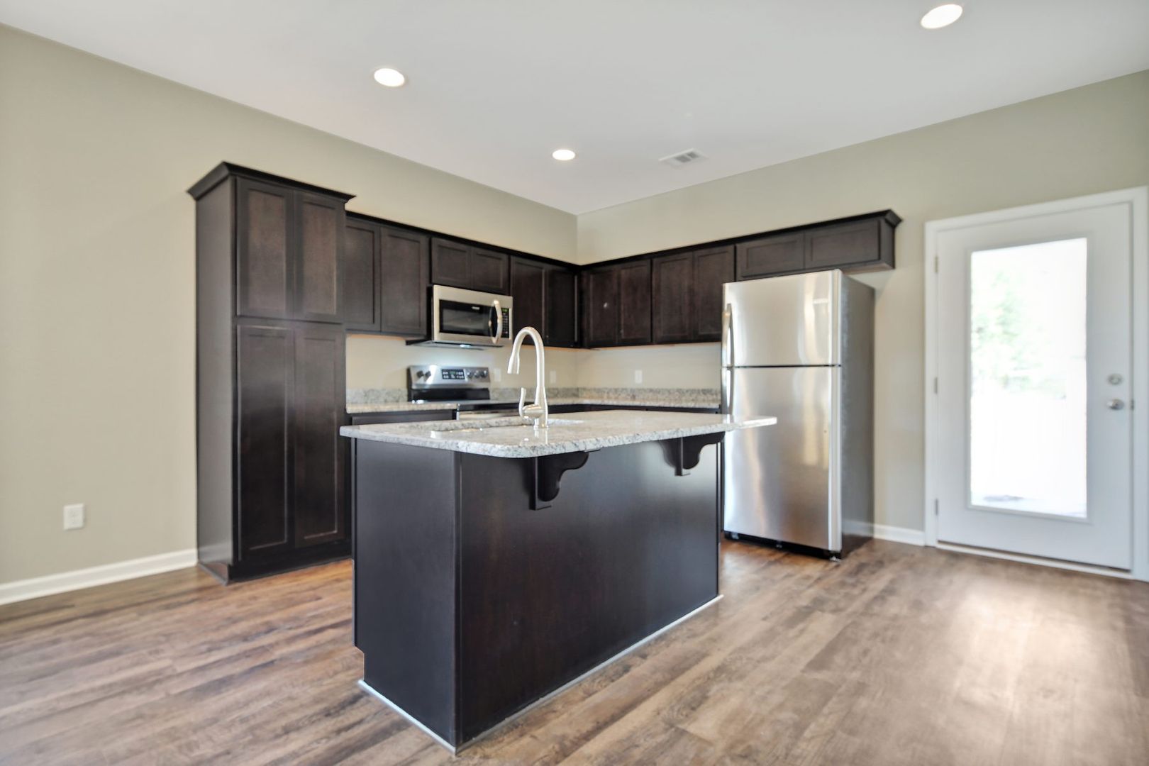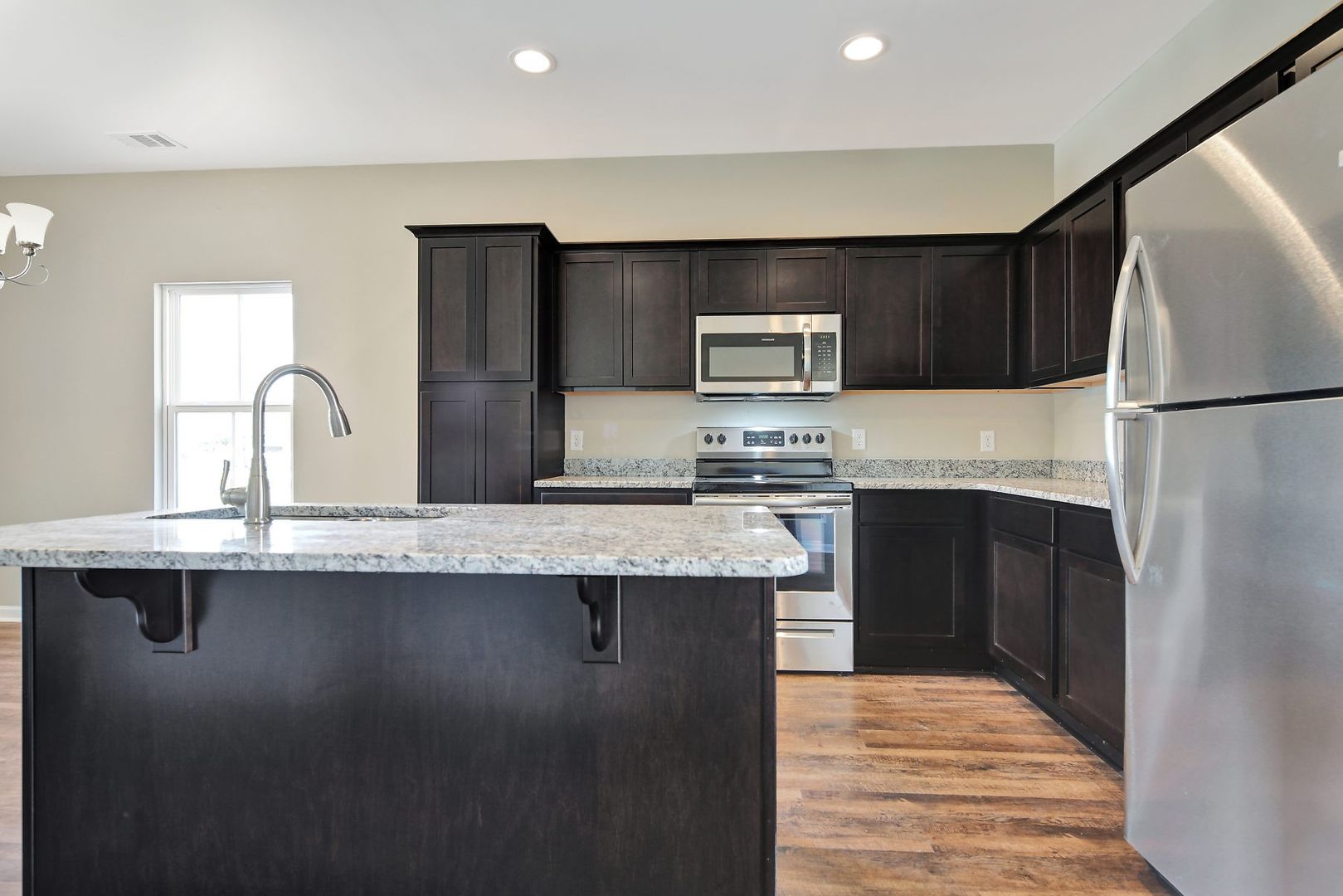 - Modern kitchen with stainless steel appliances, island with bar seating, and ample counter/cabinet space