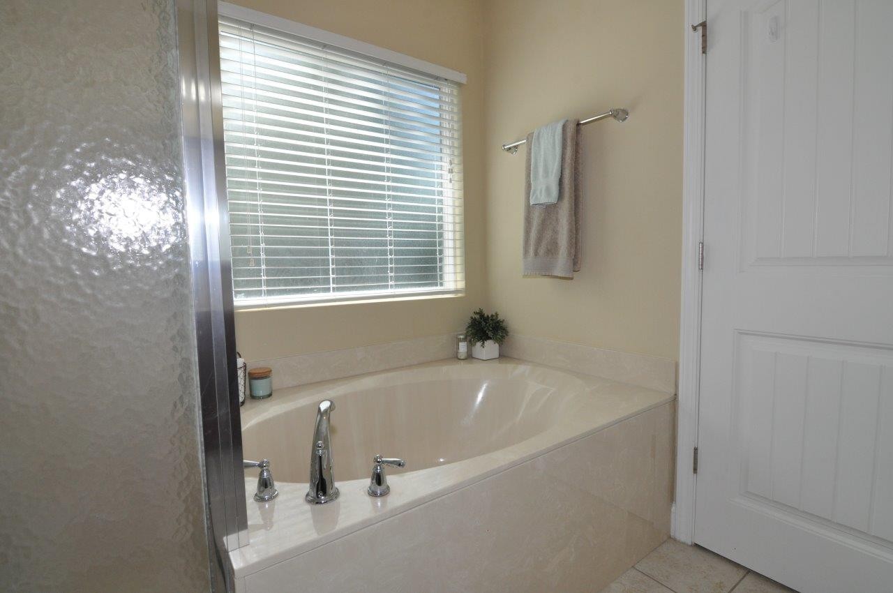 - Main-level master suite with double vanity, garden tub, and separate shower