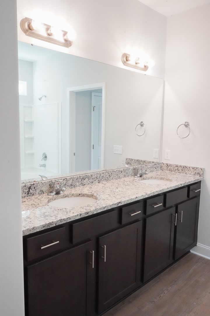 - Primary suite with walk-in closet and spa-inspired bath featuring dual vanities, walk-in shower with glass door, and private water closet