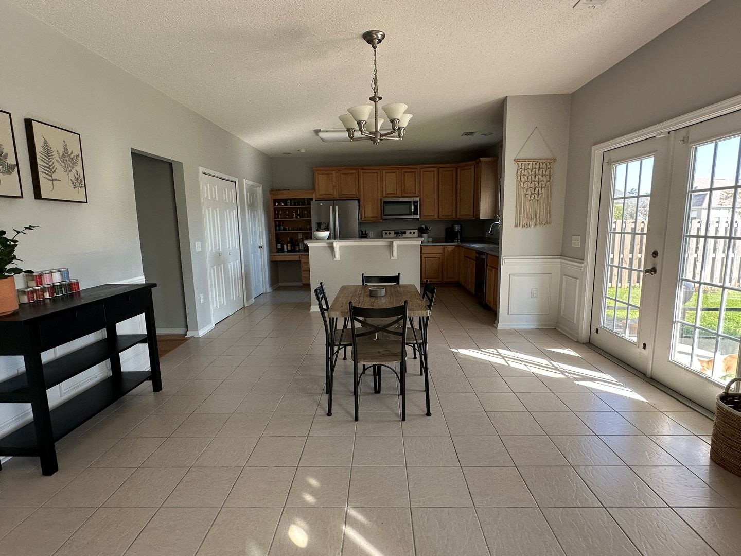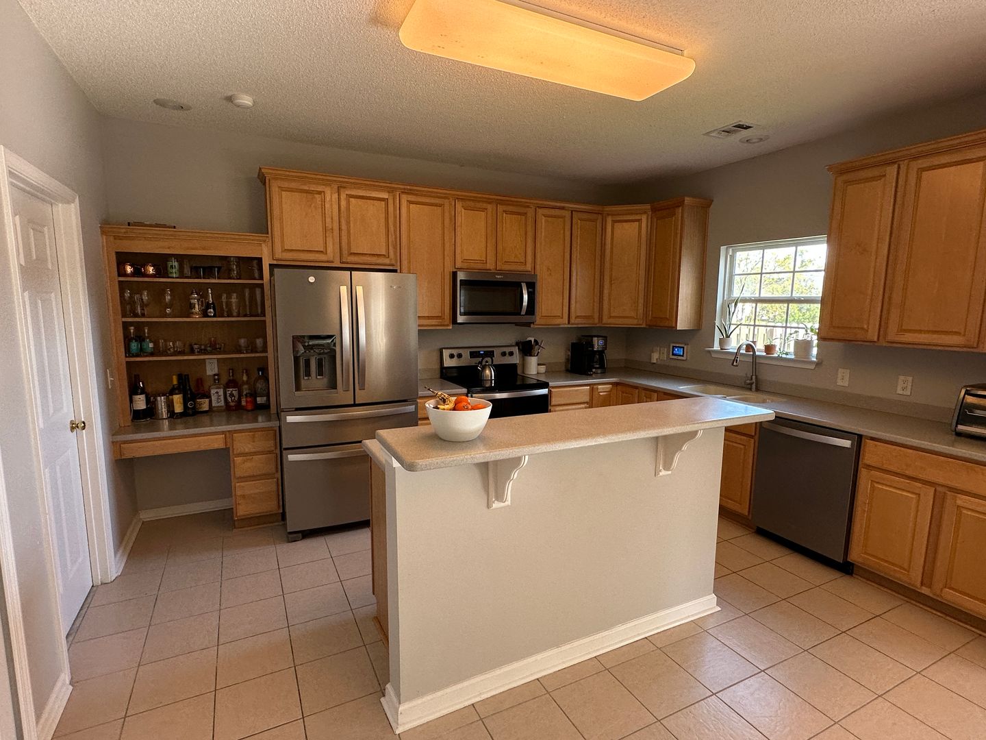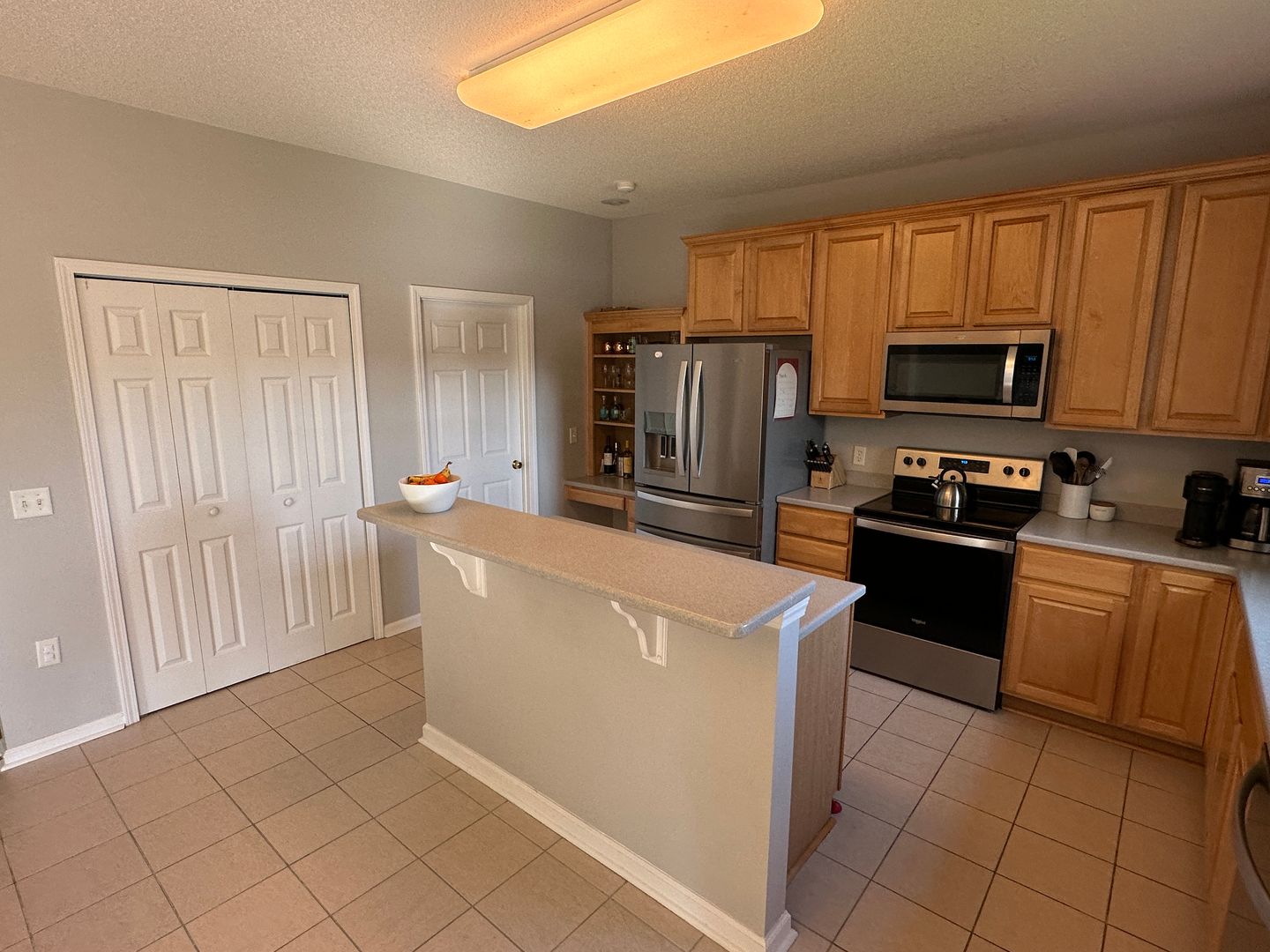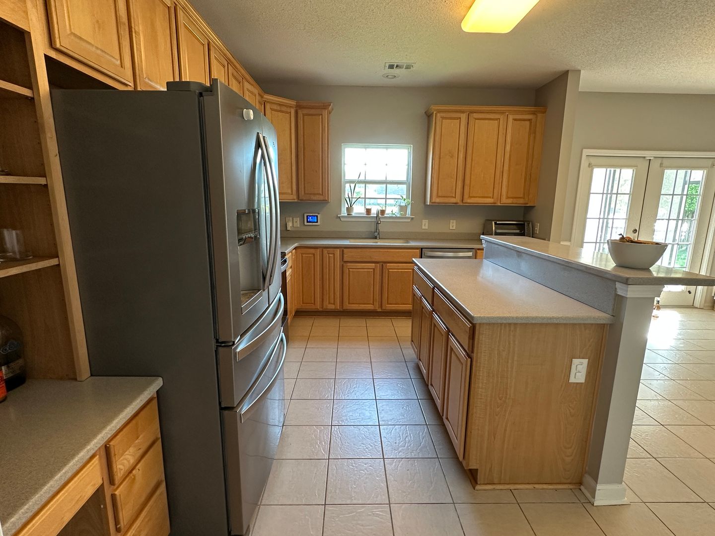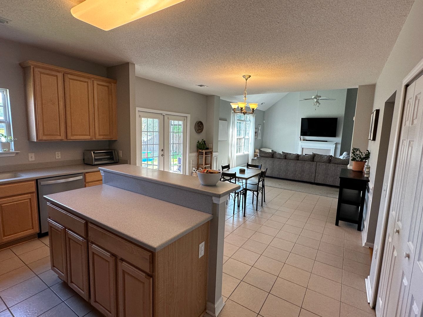 - Modern kitchen with island, breakfast area, and views of family room with gas fireplace