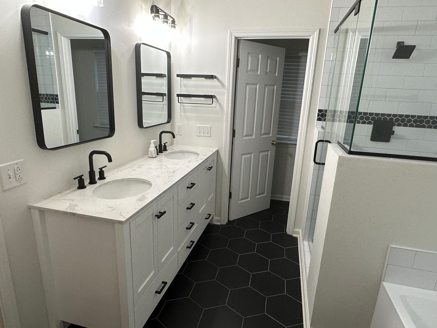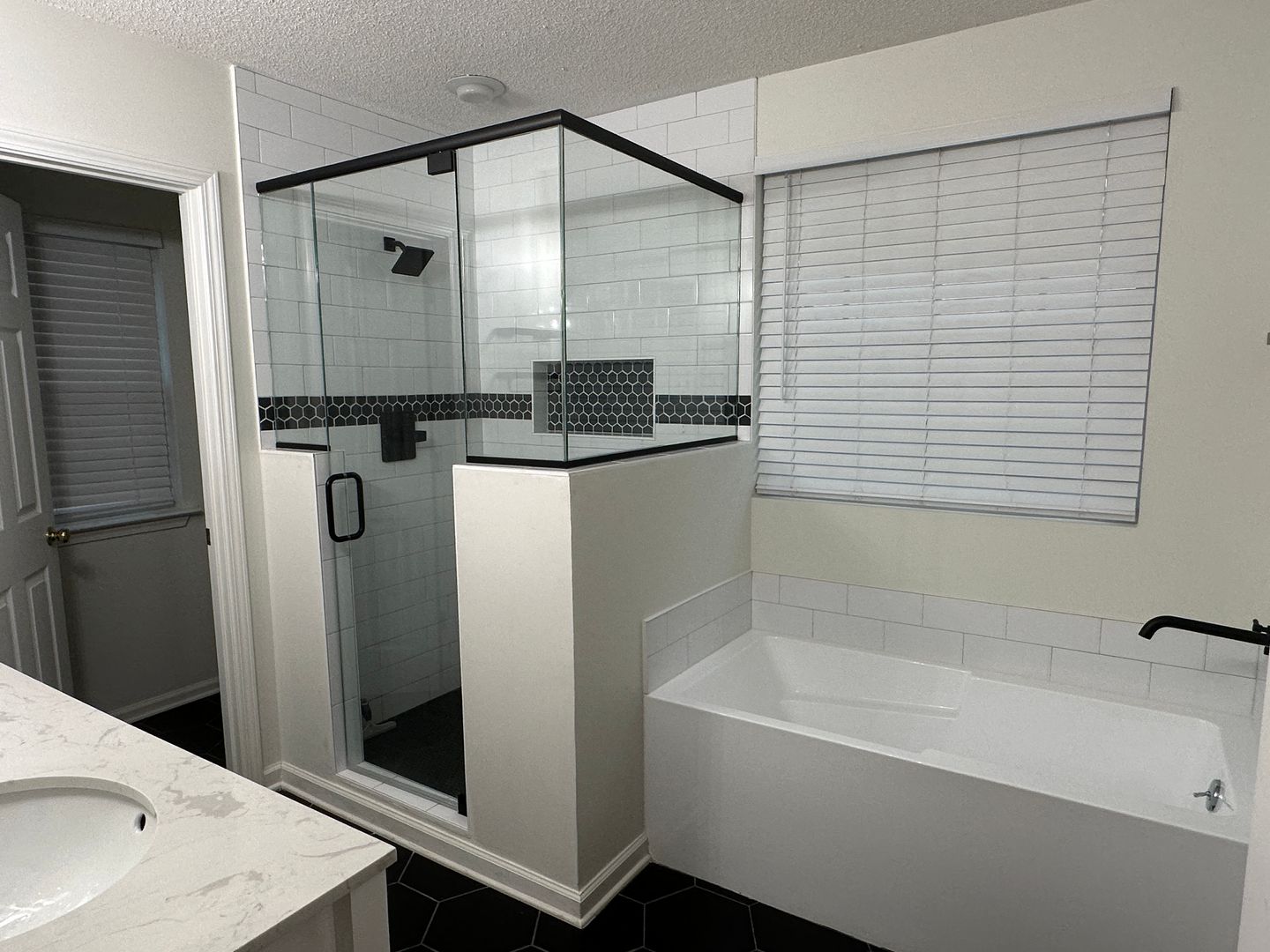 - Main bedroom with vaulted ceilings; main bathroom with double vanities, soaking tub, and separate shower