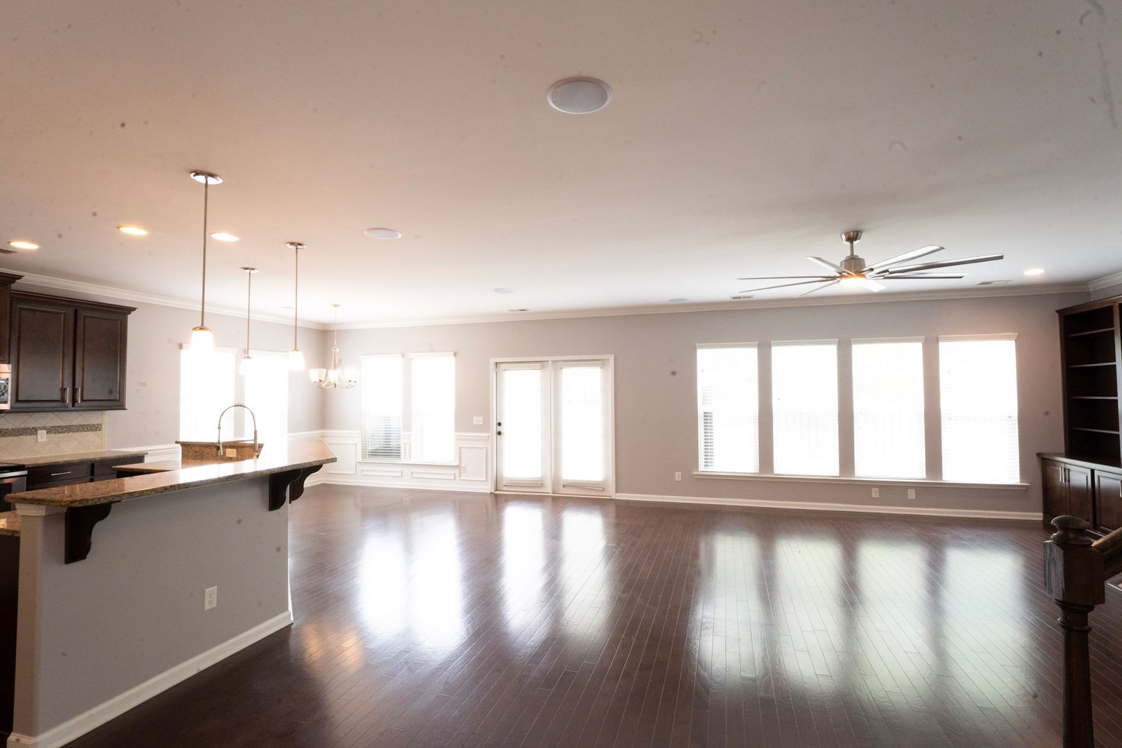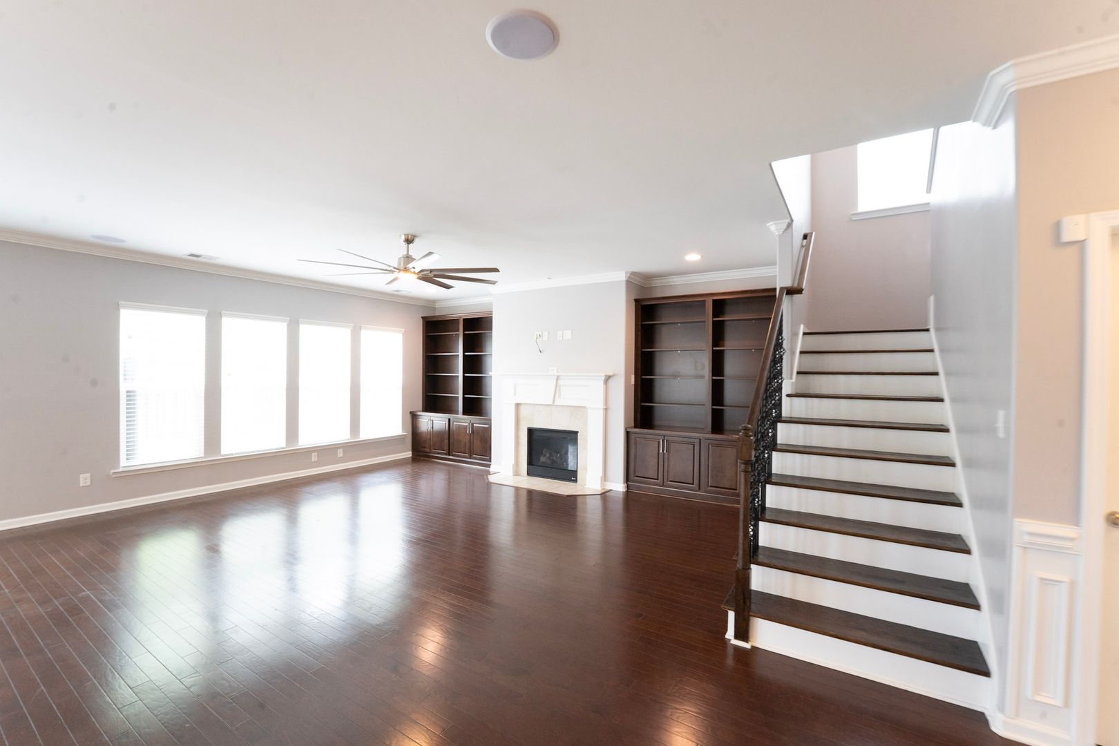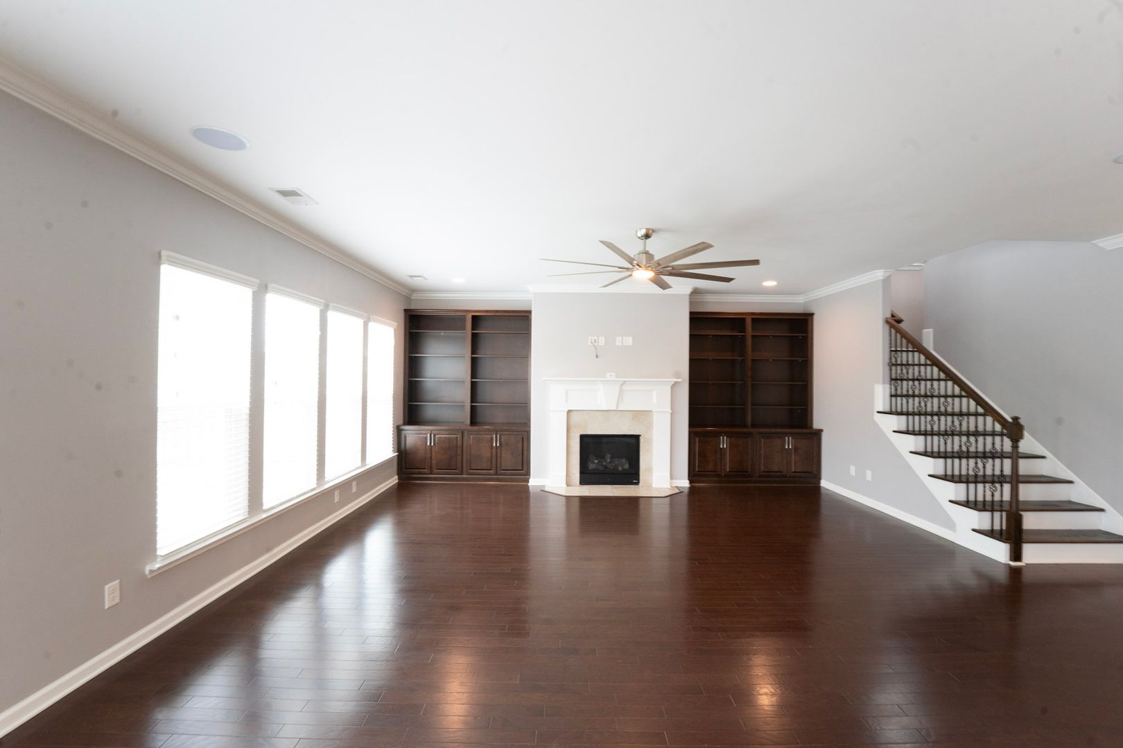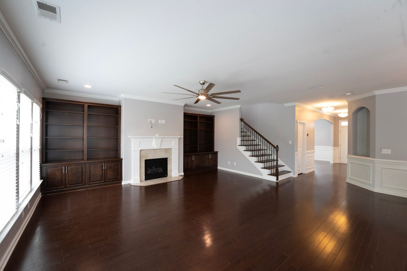 - Living room with built‑in shelves, large ceiling fan, gas fireplace (unsure of use), and built‑in ceiling speakers (not currently connected)