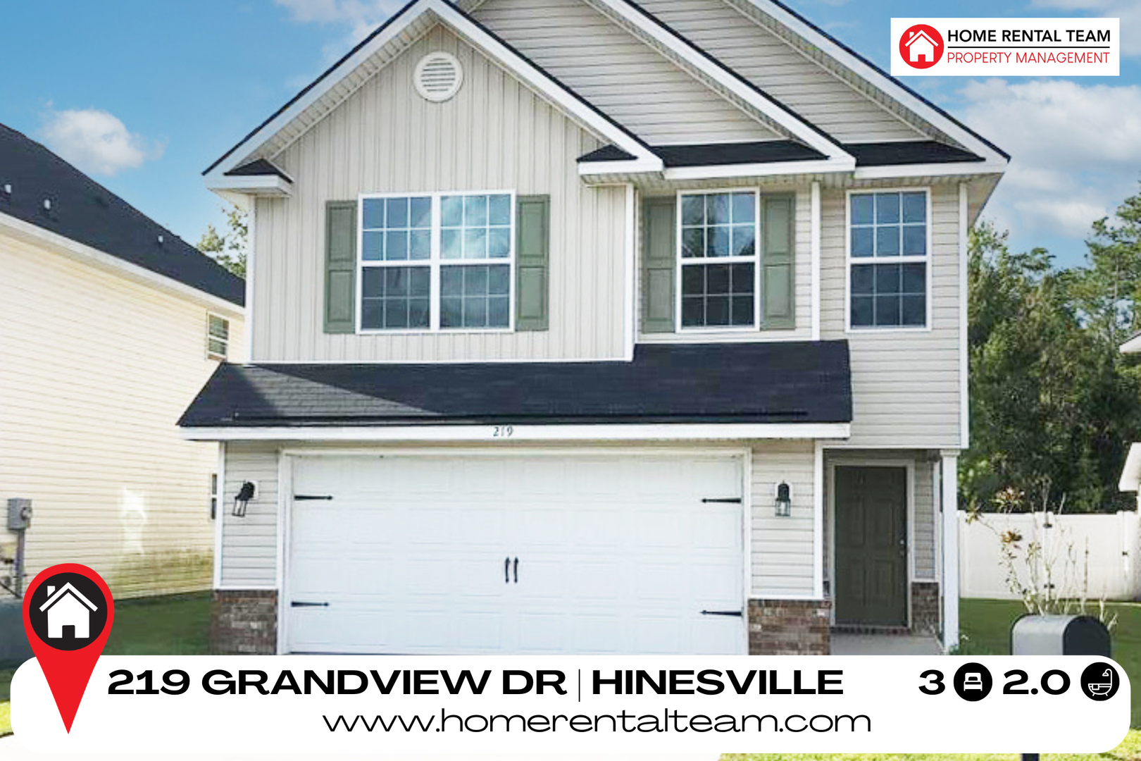 Welcome to 219 Grandview Drive in Griffin Park! This beautiful 2-story home offers 3 bedrooms, 2 bathrooms, and a spacious open-concept layout perfect for modern living. Conveniently located just minutes from three Fort Stewart gates, schools, shopping, and dining, this property combines comfort with accessibility.